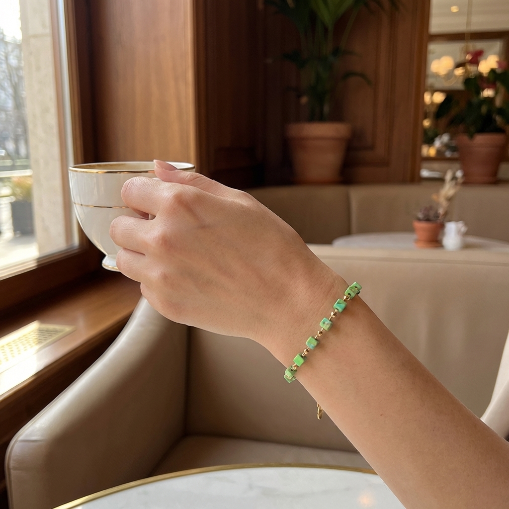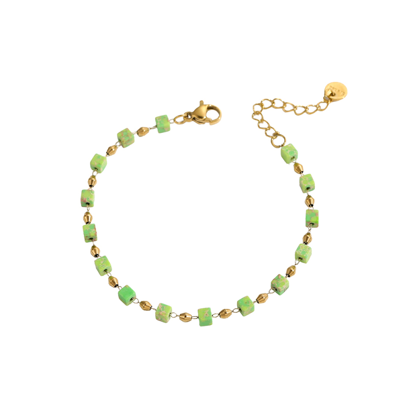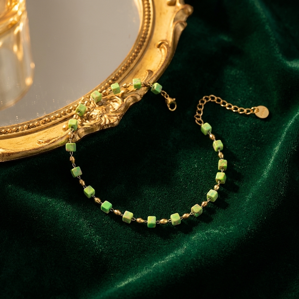 * Regular Arrangement: Light green cube beads and gold double-cone metal beads alternately connected.