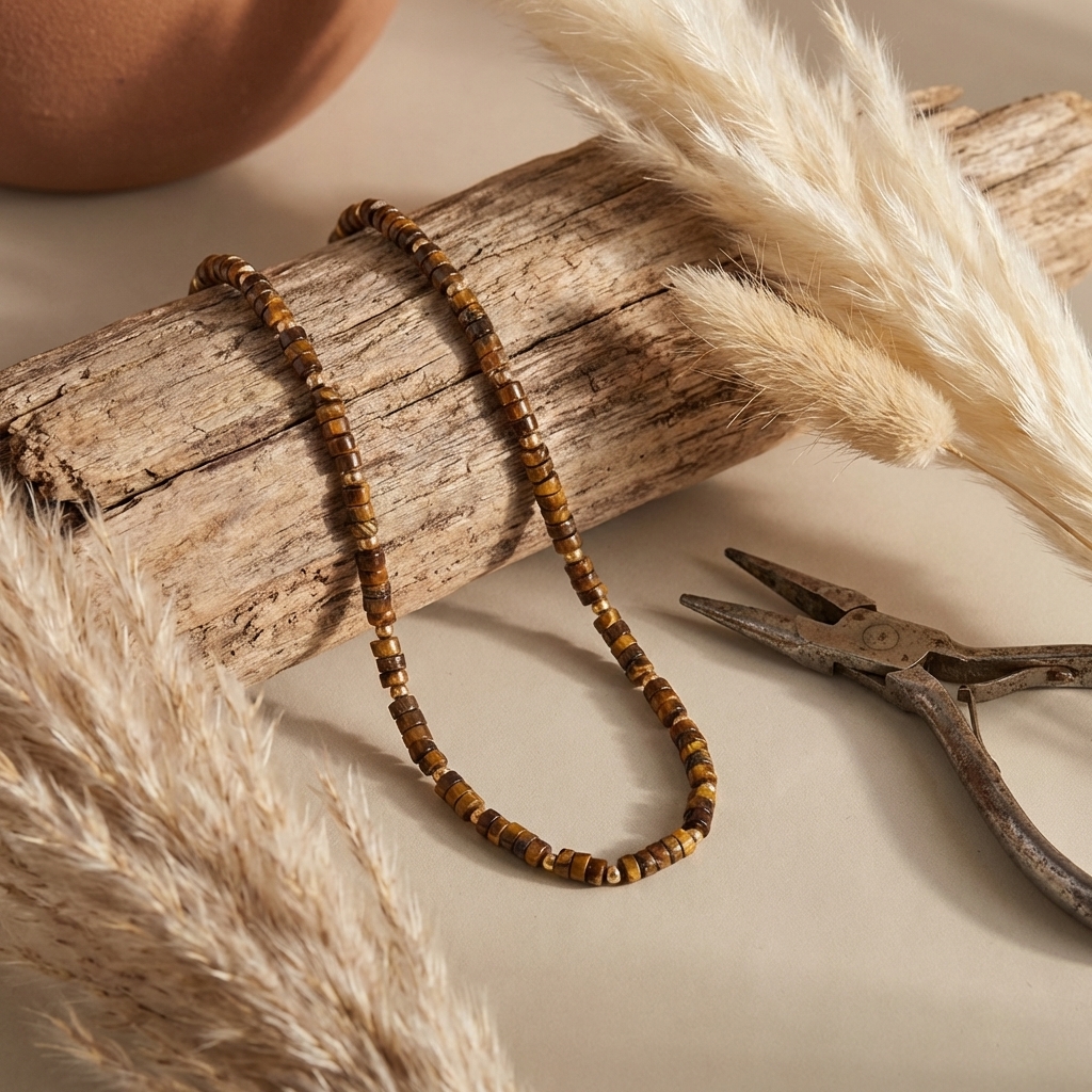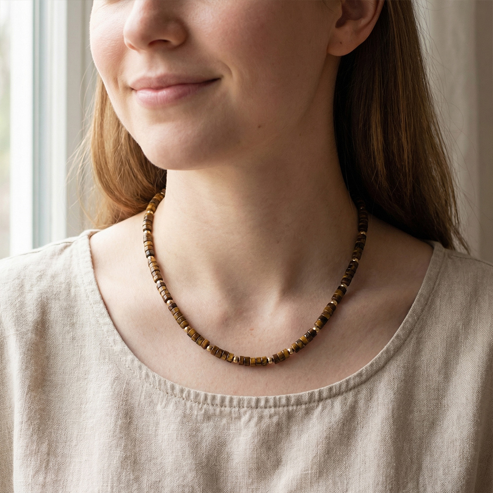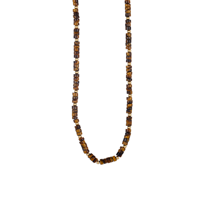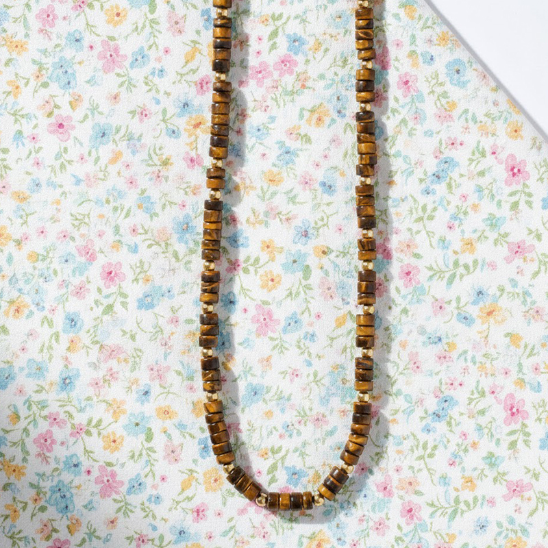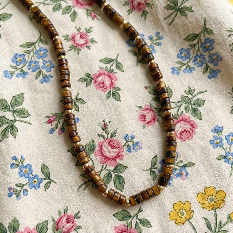 The necklace is composed of irregularly shaped cylindrical natural stone beads strung together, featuring the brown-gold veining of tiger’s eye. Each pair of main beads is adorned with a 14K gold-plated stainless steel bead.