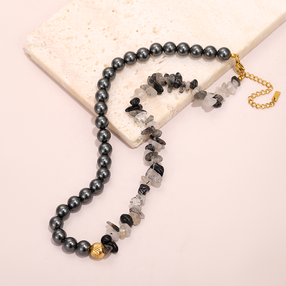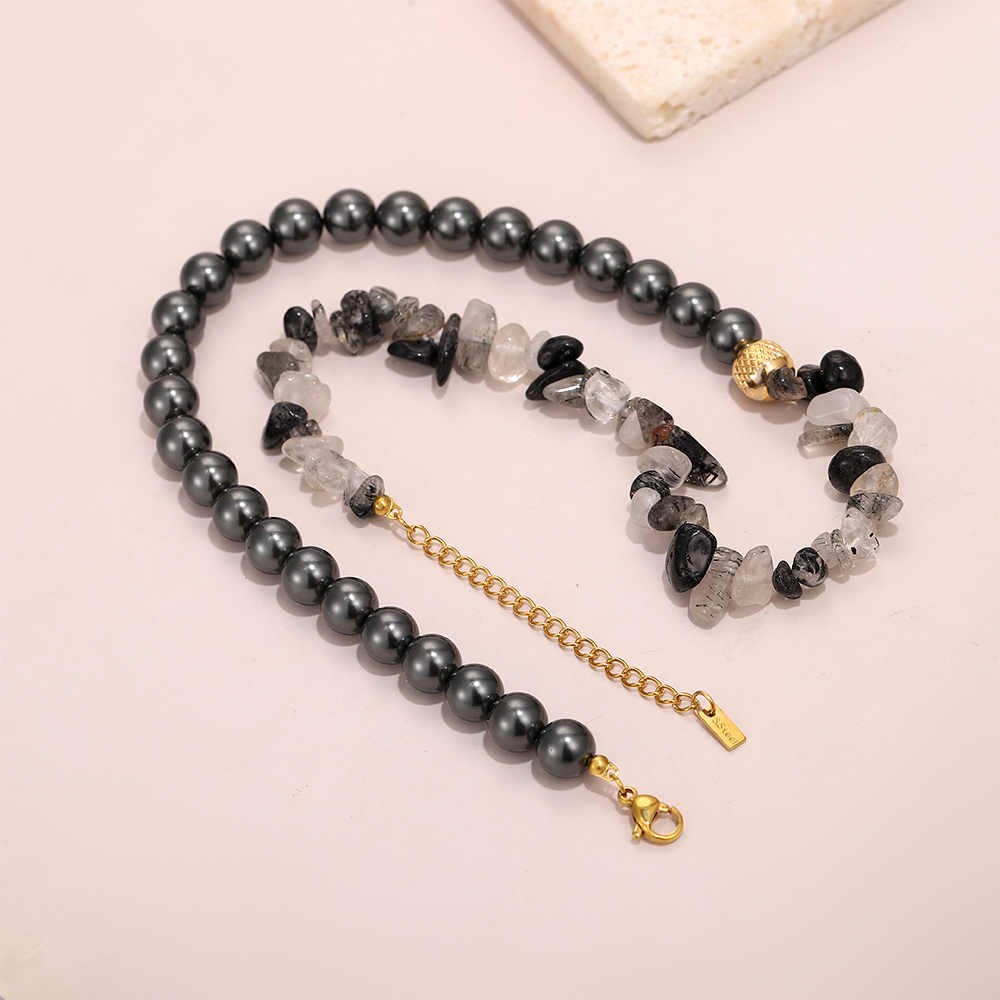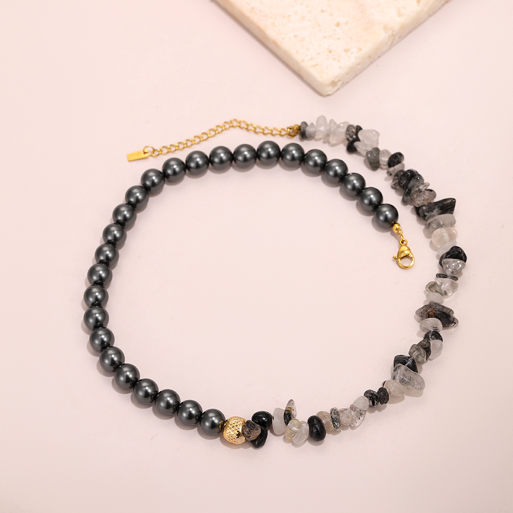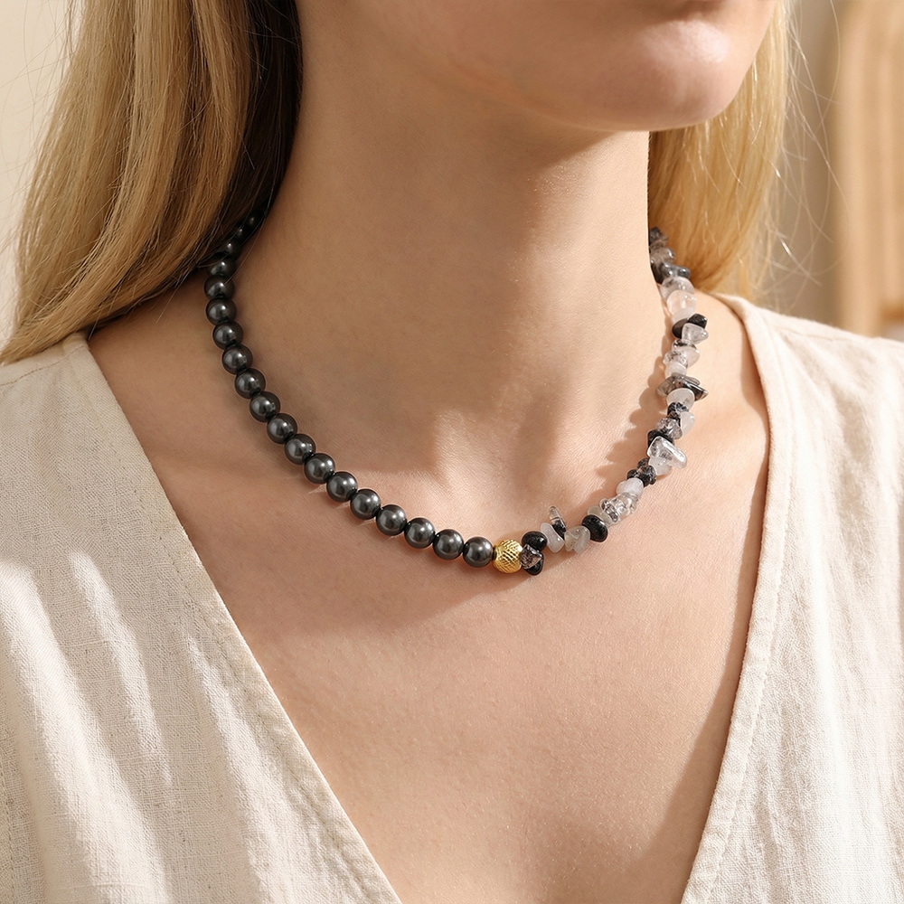 Asymmetrical Structure: The left side features uniformly round, dark-colored mother-of-pearl beads; the right side features irregularly shaped, fragmented crystal beads.