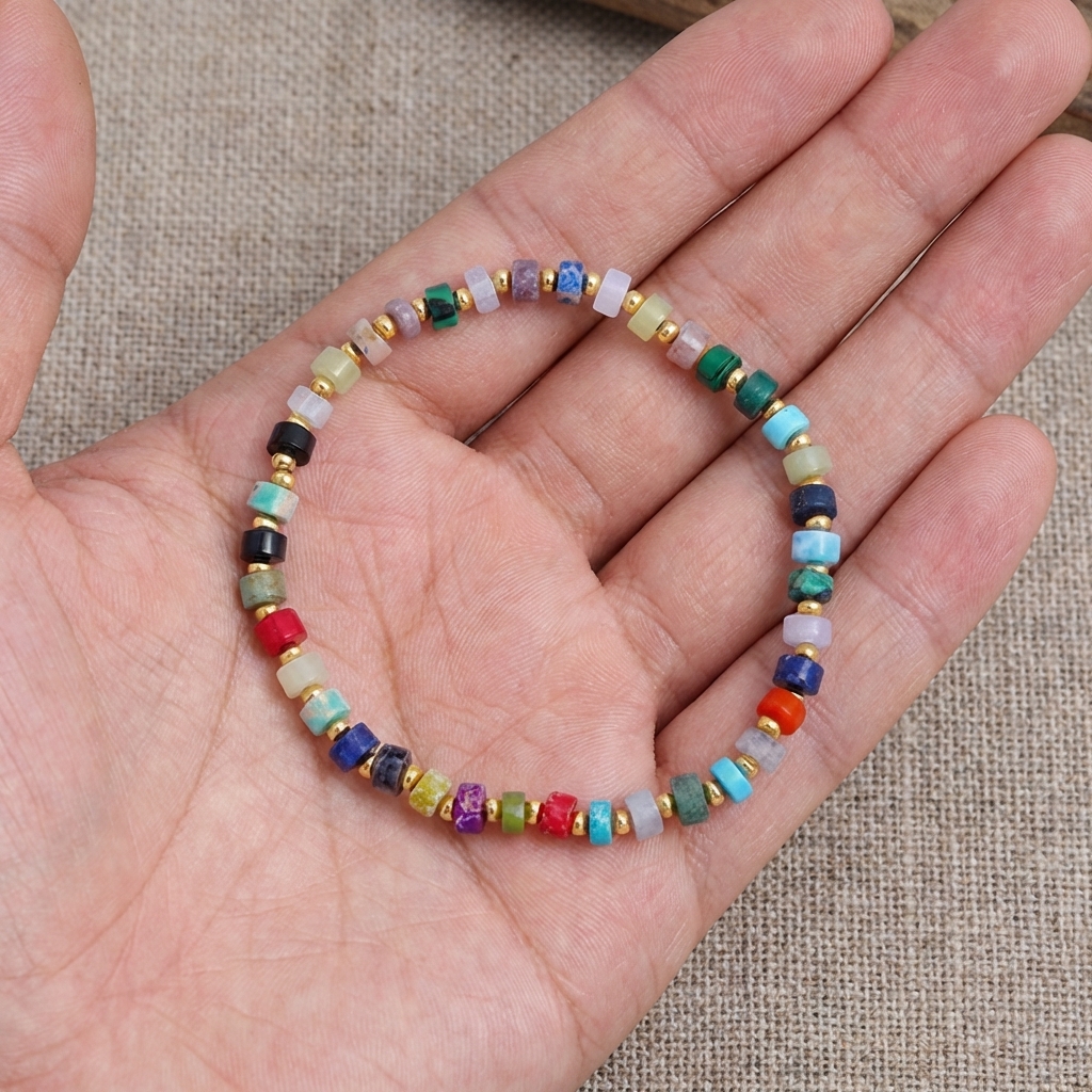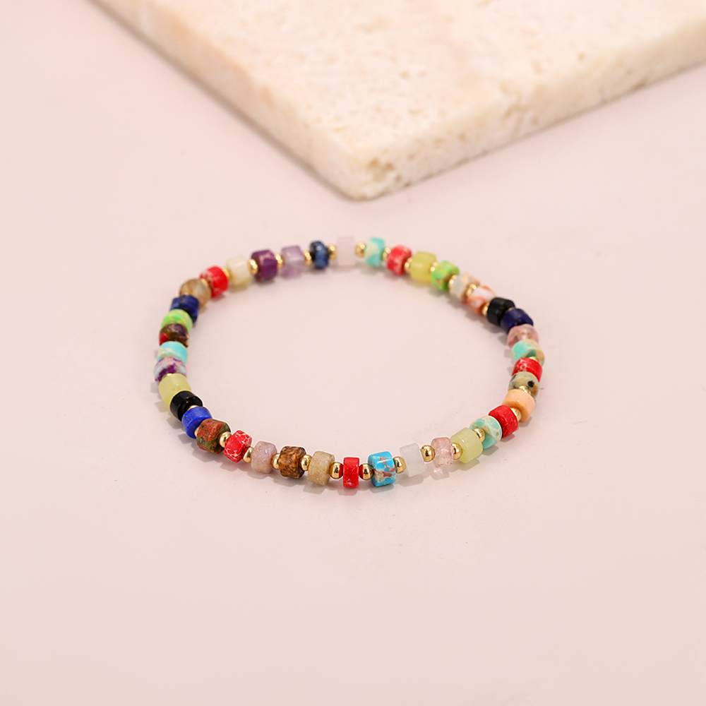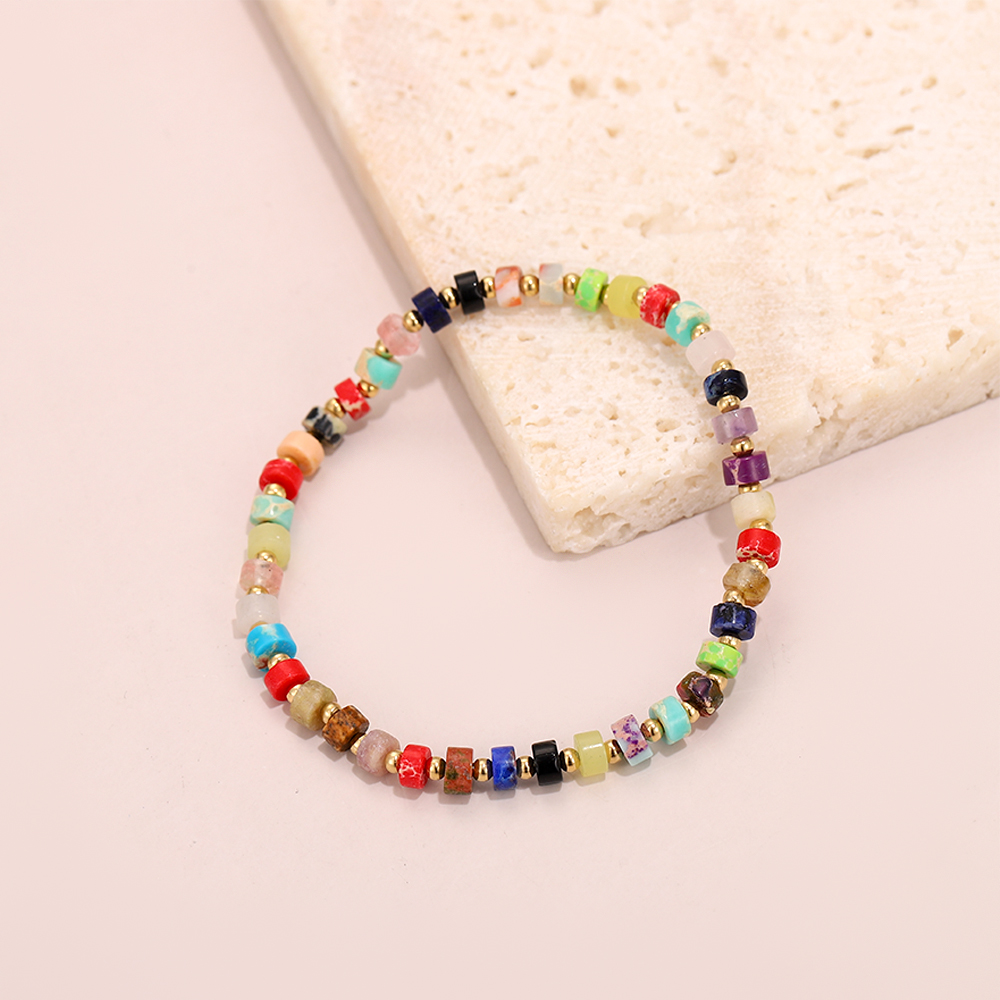 Closed circular design, composed of alternating small square beads and tiny gold round spacer beads.