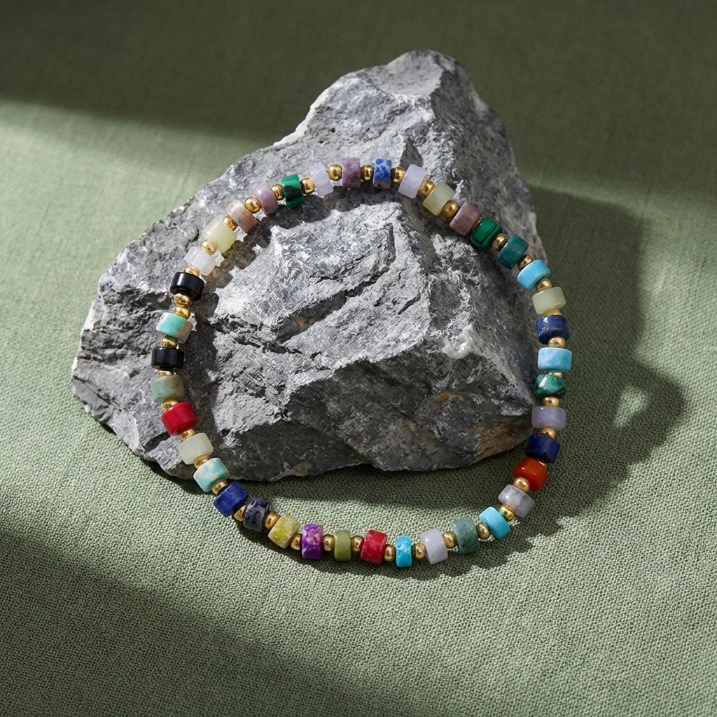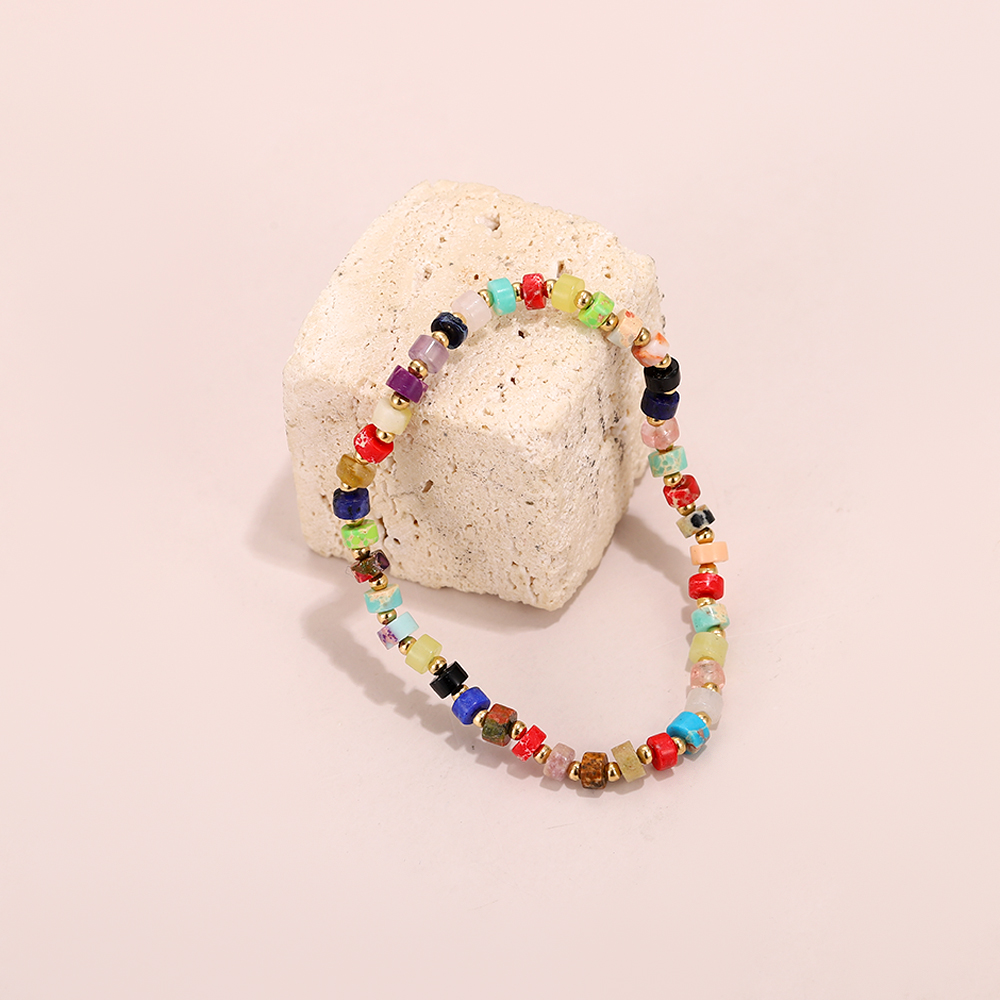 Can be worn alone as a focal point or layered with other solid-colored bracelets.