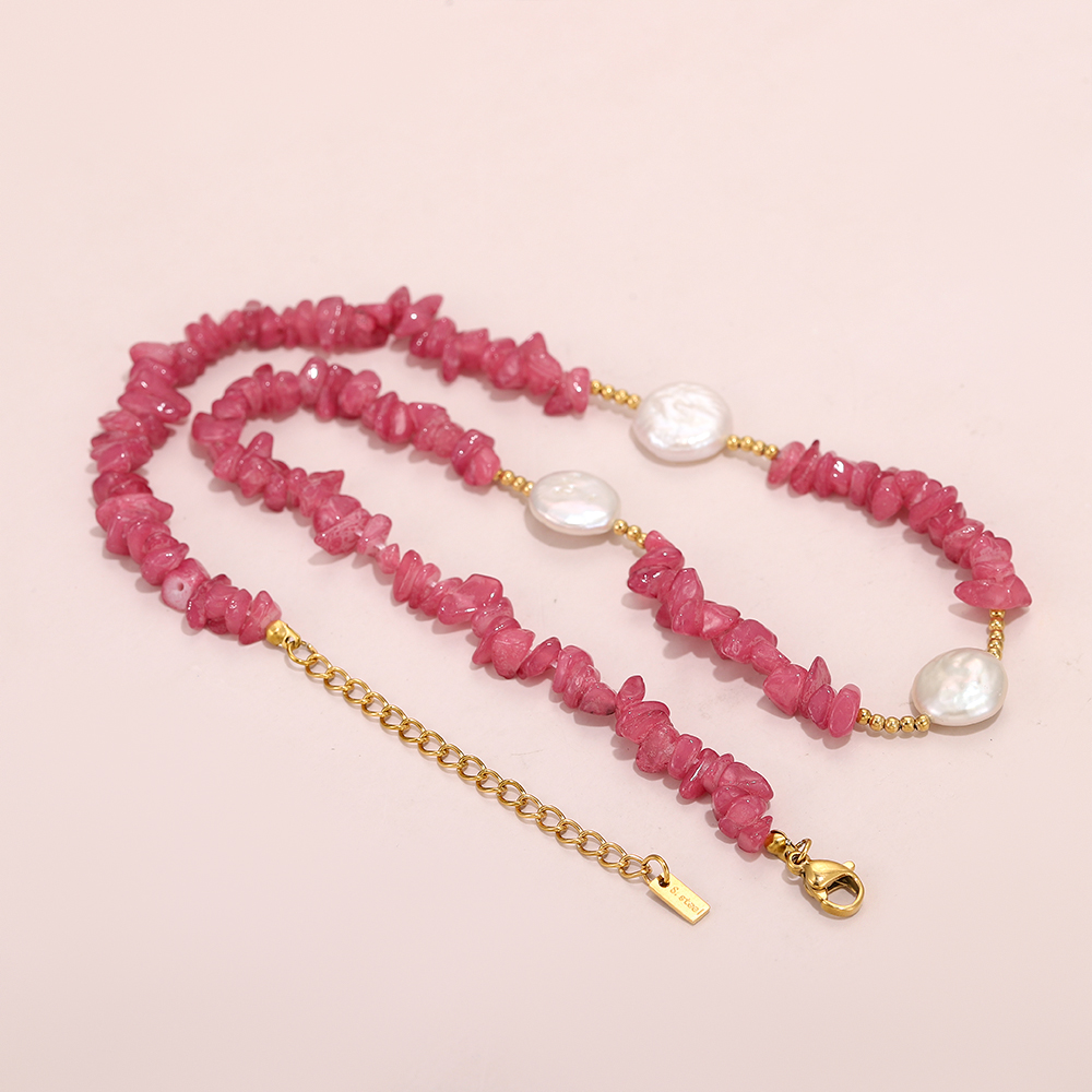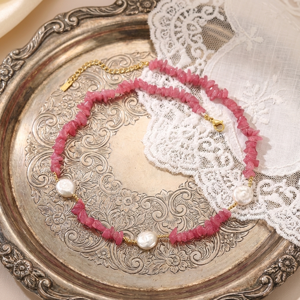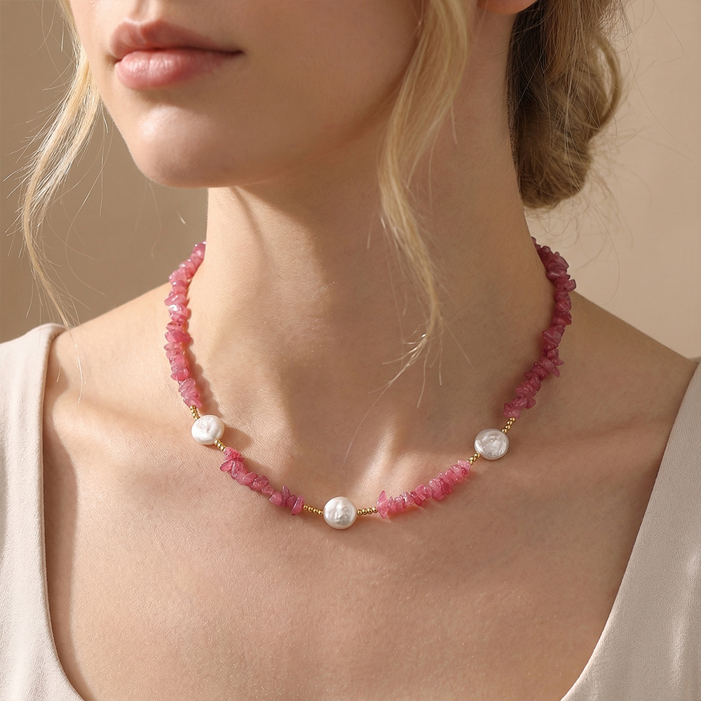 Main Bead: Irregularly cut semi-transparent pink crystal chips, showcasing the rustic beauty of natural raw stones, with a soft, cherry blossom pink hue.