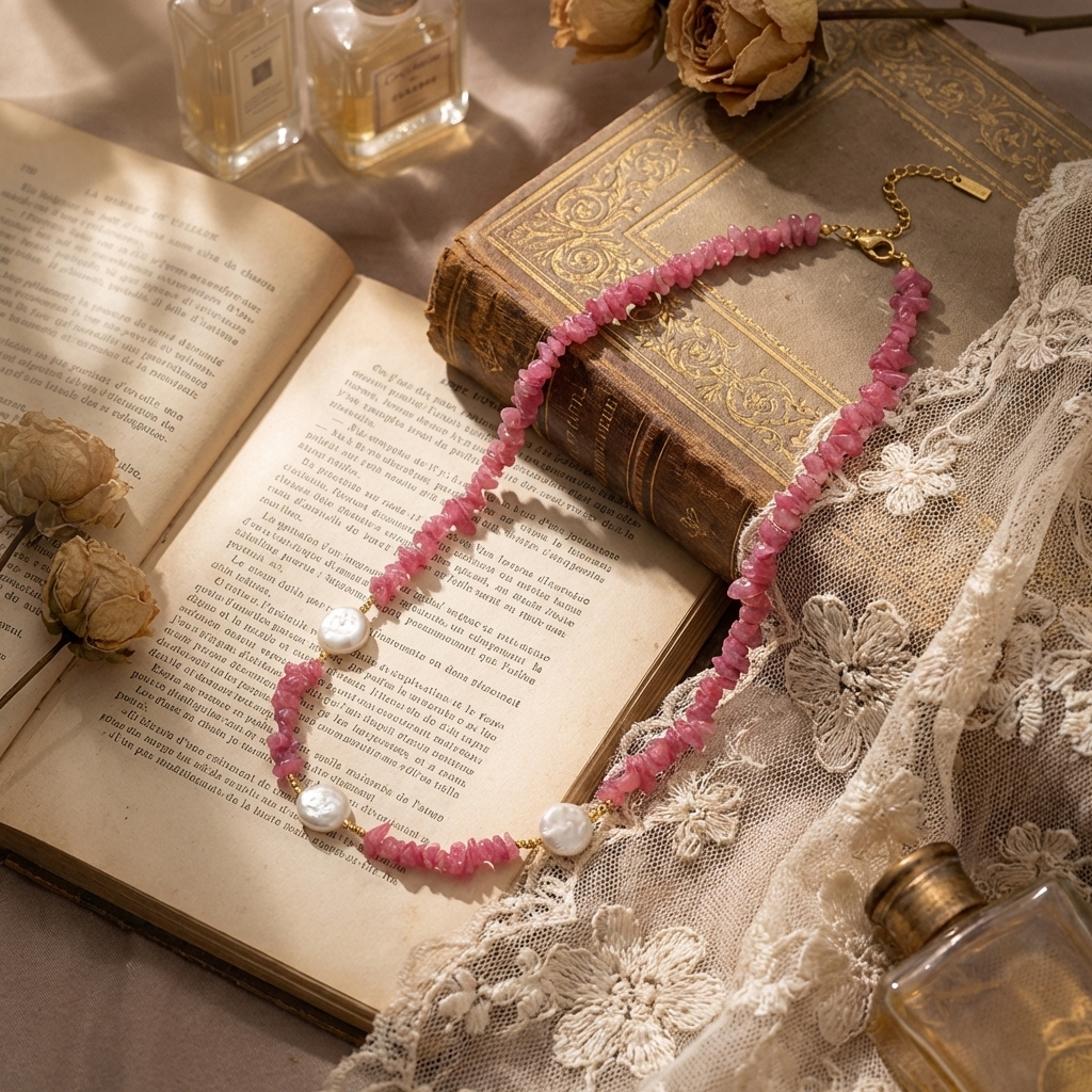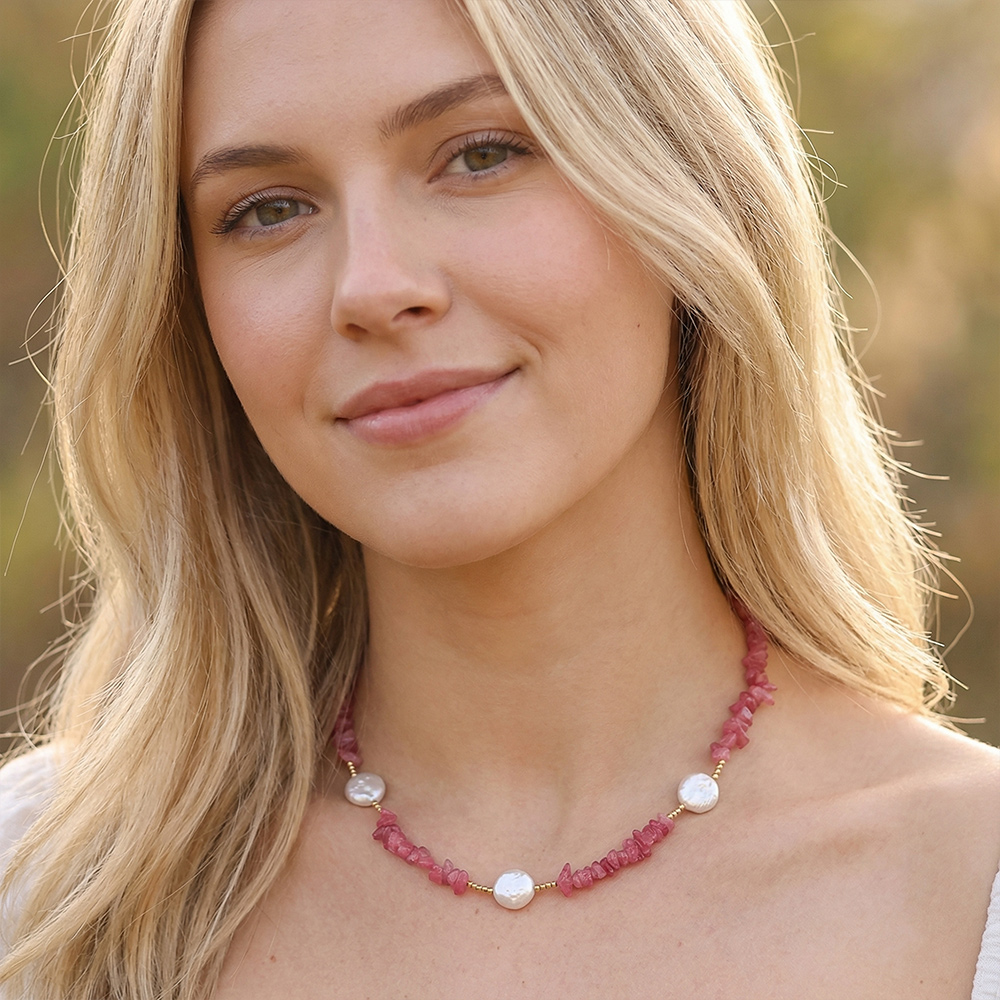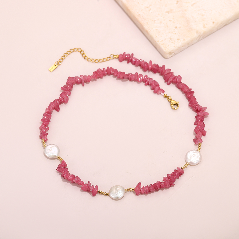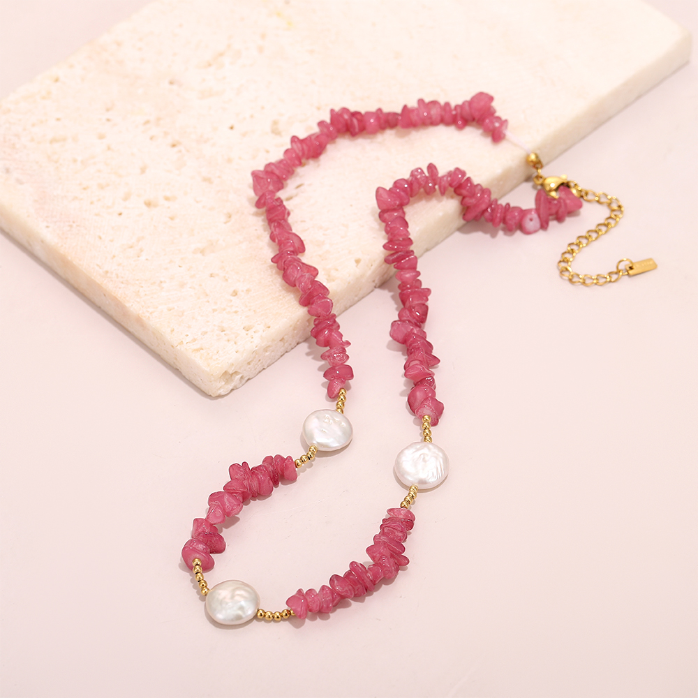 Main Bead: Irregularly cut semi-transparent pink crystal chips, showcasing the rustic beauty of natural raw stones, with a soft, cherry blossom pink hue.