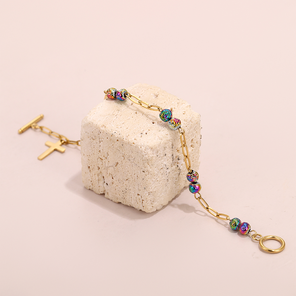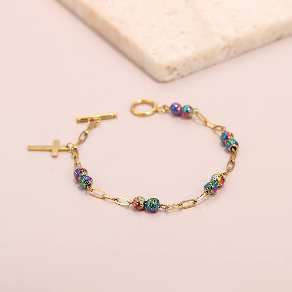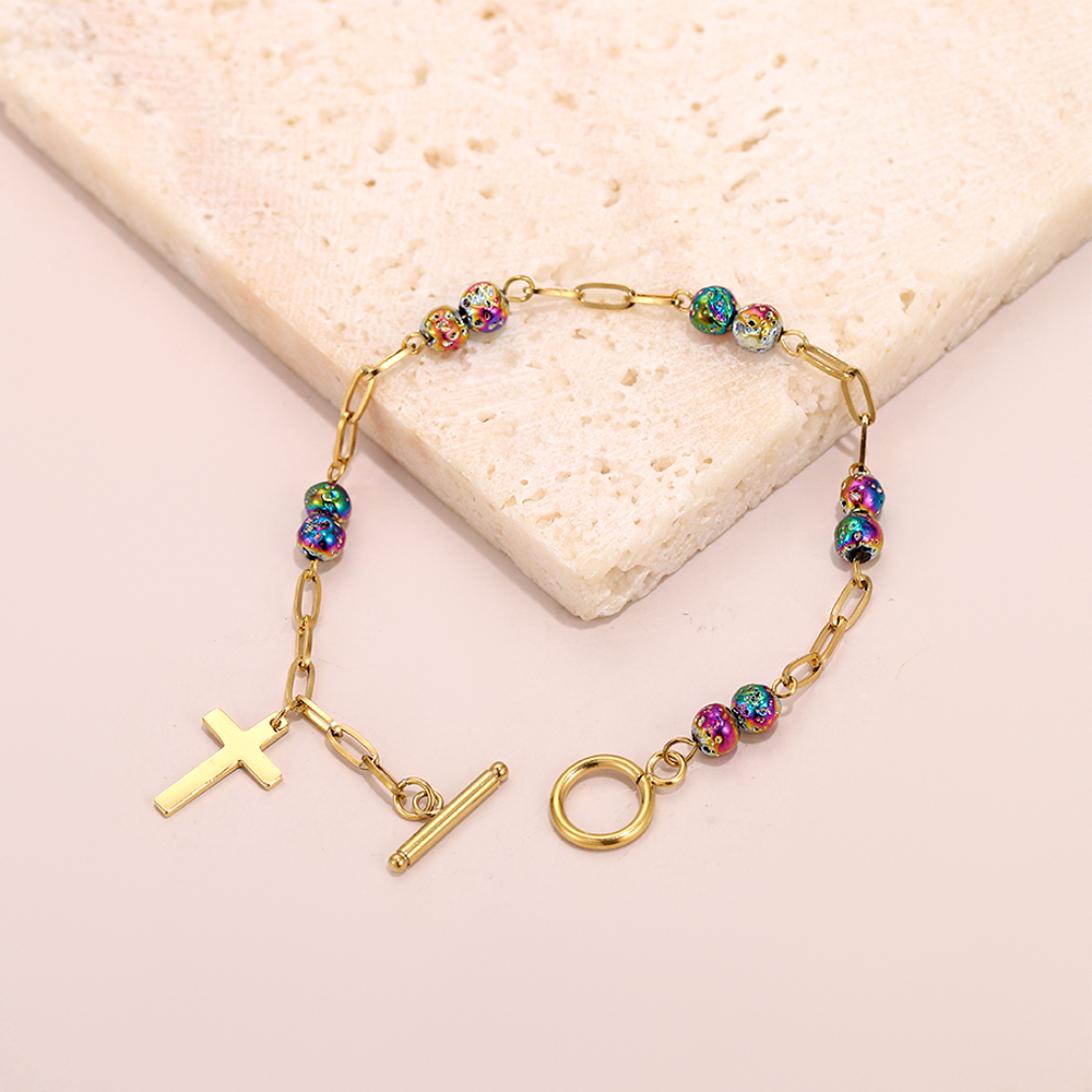 Main Color: Stainless steel plated with 14K gold (chain, cross, clasp) paired with vibrant multicolored beads.